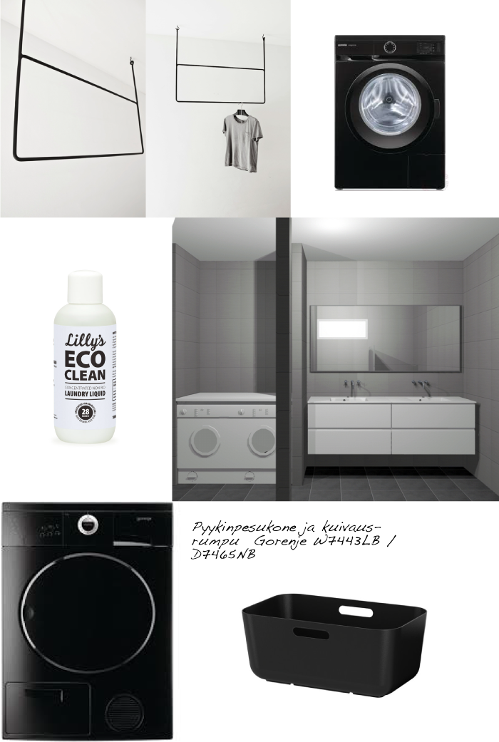 Yläkerran vaatehuoneen kodinhoitopiste alkaa olla tavaroita myöten toteutusvalmis. Pesukoneeksi ja kuivausrummuksi M valitsi mustat Gorenjen laitteet. Jospa nuo mustat laitteet innostavat miestä myös ihan käytännön pyykkihommiinkin (kommentti tuli heti vierestä: tässä huushollissa pestään pyykkiä yhdessä tasaisen epäsäännöllisesti).