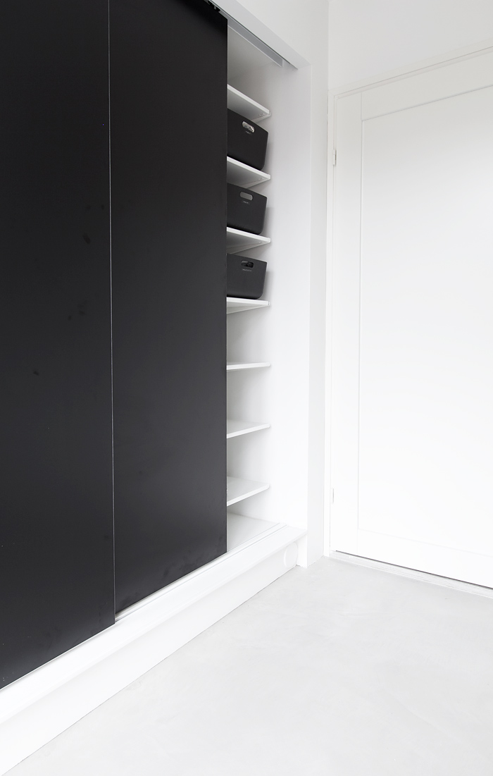 Our entrance hall cabinet is finally finished. We decided to, after some expensive offers, to build the doors by self. So here they are. Black sliding doors.
