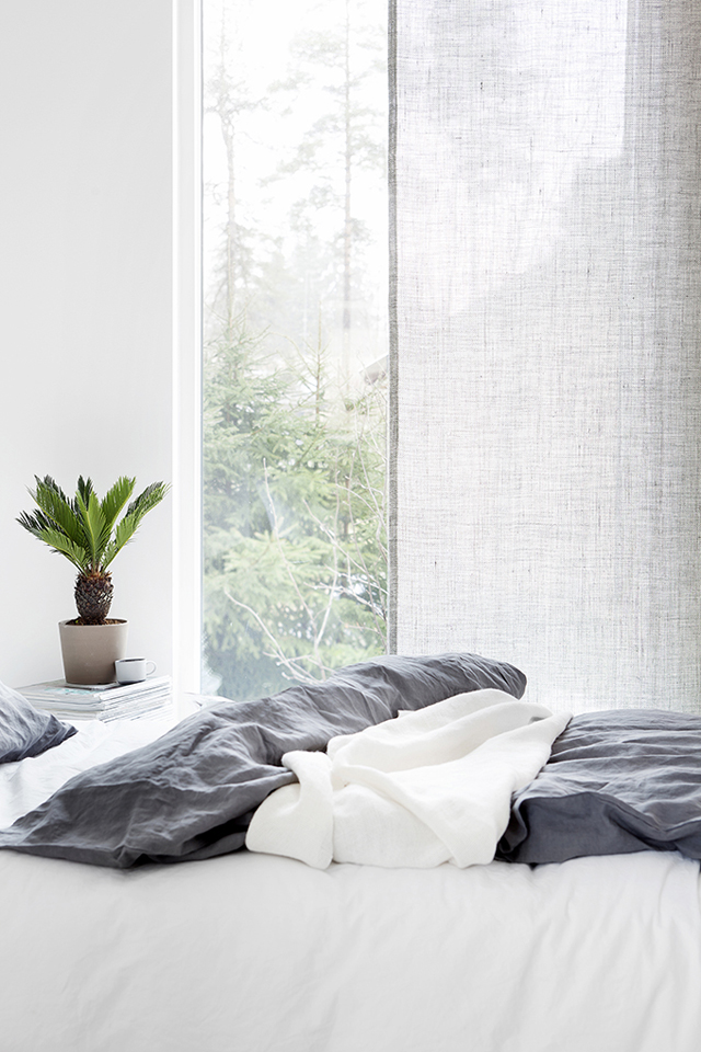 Näiden kuvien myötä minulle tuli hirveä hinku lykätä viherkasveja joka nurkkaan ja ripustella tuollaisia ihanan rouheisia pellavaverhoja ikkunanpieliin roikkumaan. Sikäli hämmästyttävä ilmiö, sillä viherkasvit saatikka verhot eivät jostain syystä koskaan ole kuuluneet ainakaan kovin pitkäikäisesti sisustusrepertuaariini. Mutta kun tämän tekee tyylillä ja taidolla sekä juuri oikeilla tuotteilla, muuttuu mieli kummasti.