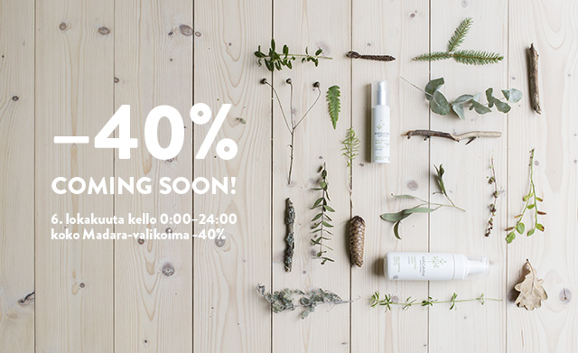 Koska arvostan hyvää laatua ja edullista hintaa, on tuotevalikoimani täydentynyt myös pikkuhiljaa aina Mádara 24h -kampanjoiden myötä. Tuolloin saa aina 24-tunnin ajan -40% alennuksen koko Mádaran valikoimasta. Seuraavan kerran tällainen mahdollisuus aukeaa 6. lokakuuta. Yli 50 euron tilauksesta Mádaran verkkokaupasta saa toimituksen ilmaiseksi ja yli 60 euron ostoksista 100 ml Miselliveden kaupanpäälle. Omiin suosikkituotteisiini lukeutuvat muun muassa kaikille ihotyypeille sopiva syväpuhdistusvaahto sekä ihoa kirkastava AHA -kuorintanaamio, jotka ovat olleet tänä syksynä ennätyskovassa käytössä. Eilisten syntymäpäivieni myötä kaivoin kaapista viimein myös blogin kautta saadun Time Miracle -yövoiteen, joka lupaa silotella kasvoilta menneiden vuosien jälkiä.