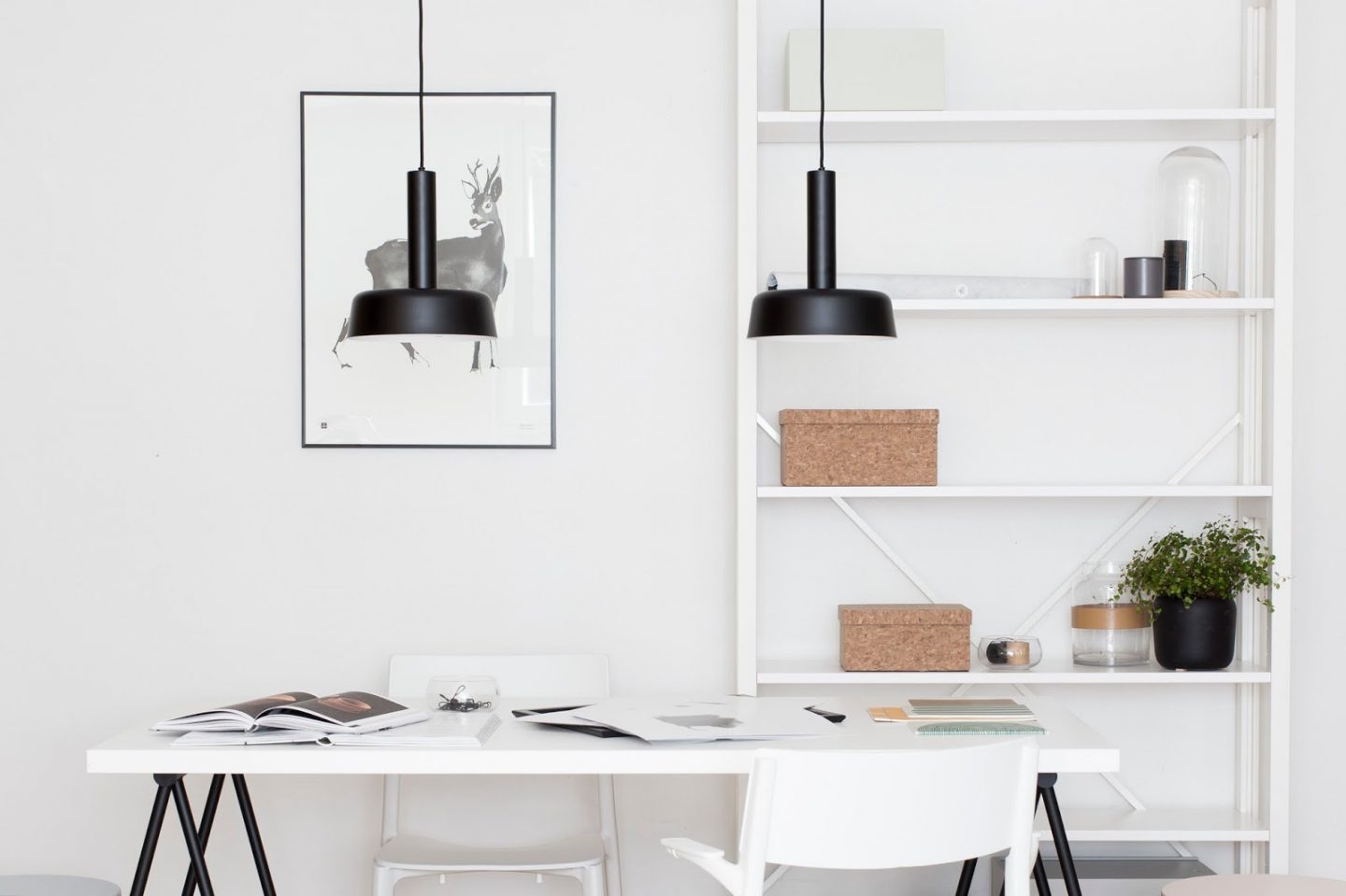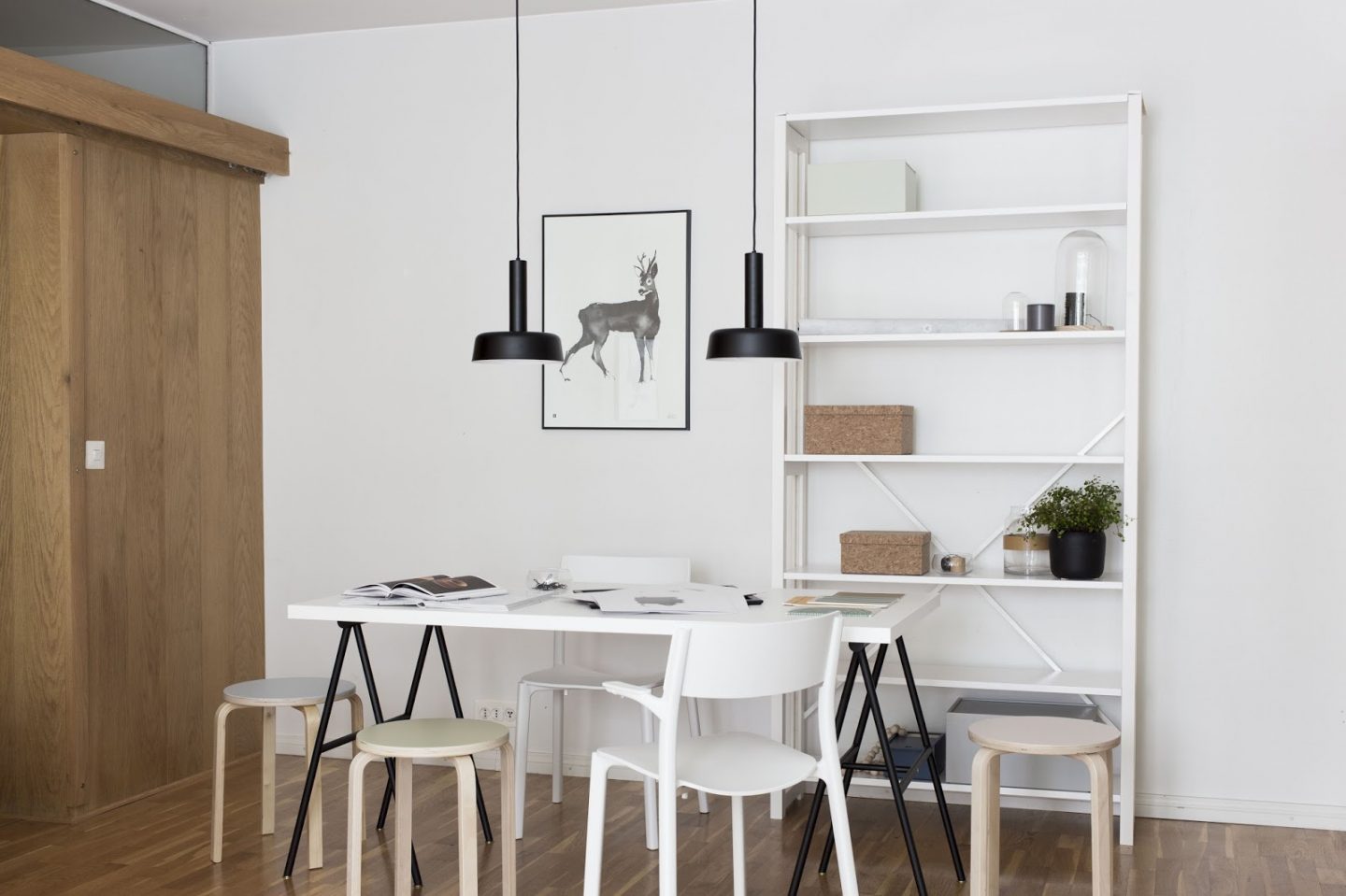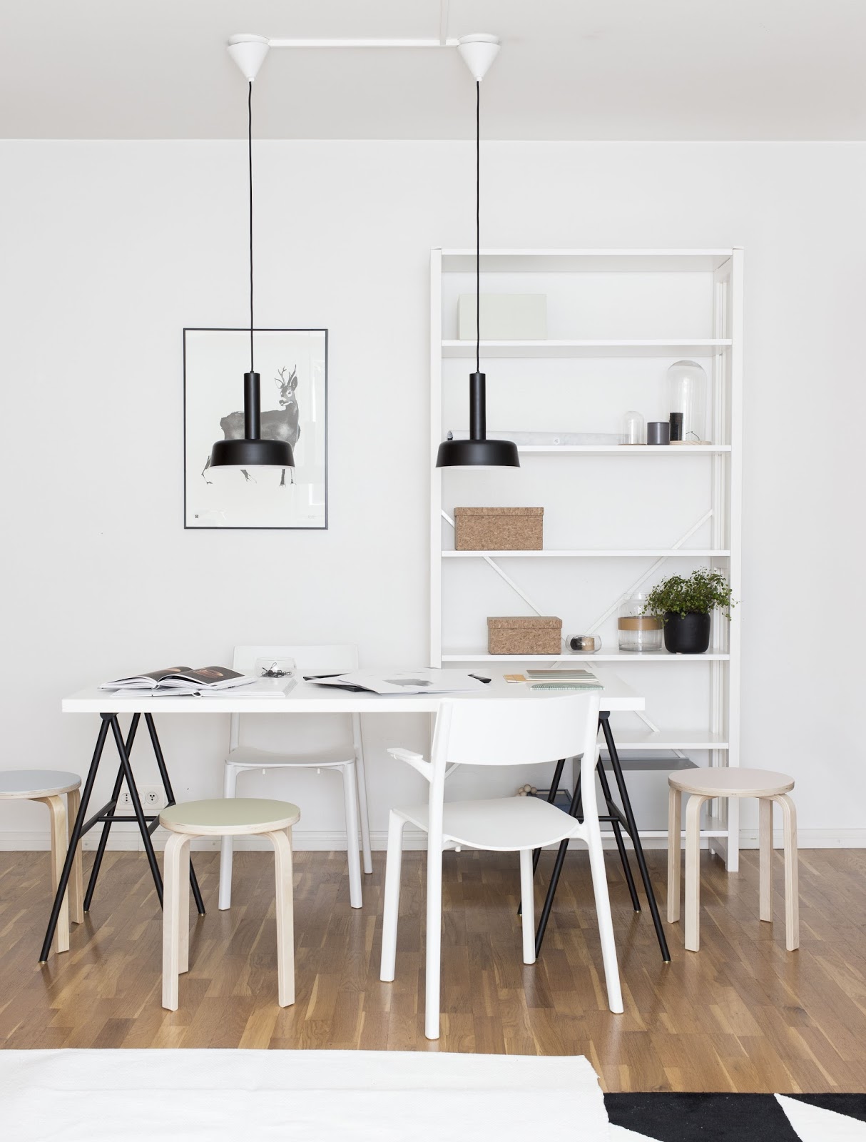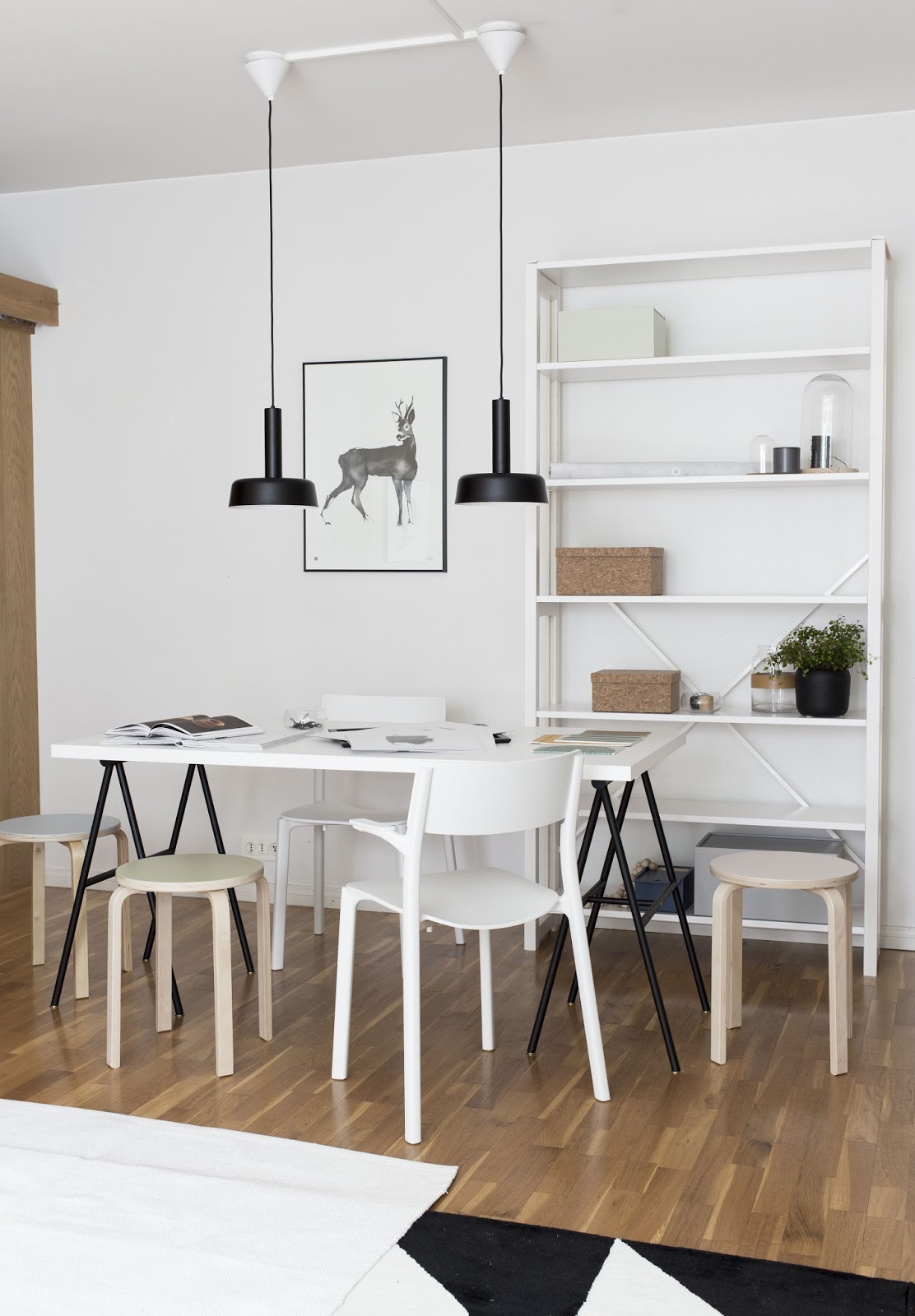 Edelleen syksyisin iskee ihan kauhea opiskeluhimo. Tänä ”syksynä” olen yrittänyt liennyttää tätä himoa raivaamalla vihdoin ja viimein työhuoneeni. Kuvia tästä projektista on tulossa blogiin piakkoin. Sitä ennen muutama inspiraatiokuva kohteesta, jonka kalustin heti ensi töikseni kesäloman loputtua. Tällä hetkellä olen niin onnekas, että työasioille on kodissamme ihan oma huoneensa. Mutta kuten jo monitoimiyksiömme osoitti, myös pienen asunnon ruokailutilan voi oikein hyvin kalustaa yhdistetyksi työtilaksi ja ruokapöydäksi. Yhdistelemällä erilaisia kevyitä huonekaluja ja itse tuunattuja juttuja saa koko tilan käytettyä hyödyksi juuri tarvitsemallaan tavalla. Pinottavat jakkarat on helppo nostaa esille, kun tarvitaan lisää istumatilaa ja ilmavassa hyllykössä säilyy järjestyksessä kaikki tarpeellinen käden ulottuvilla.